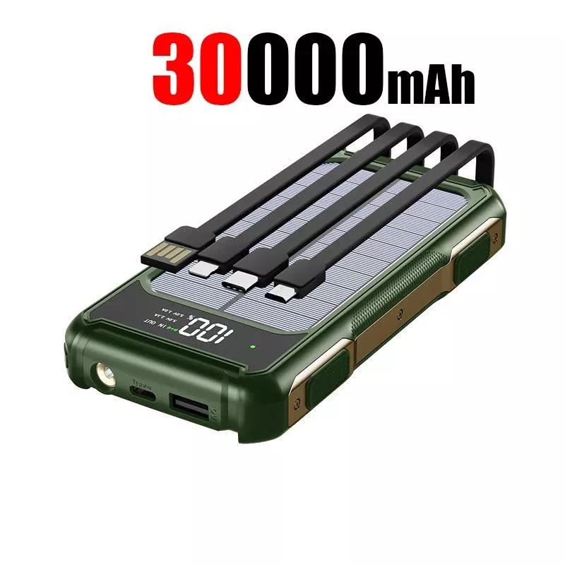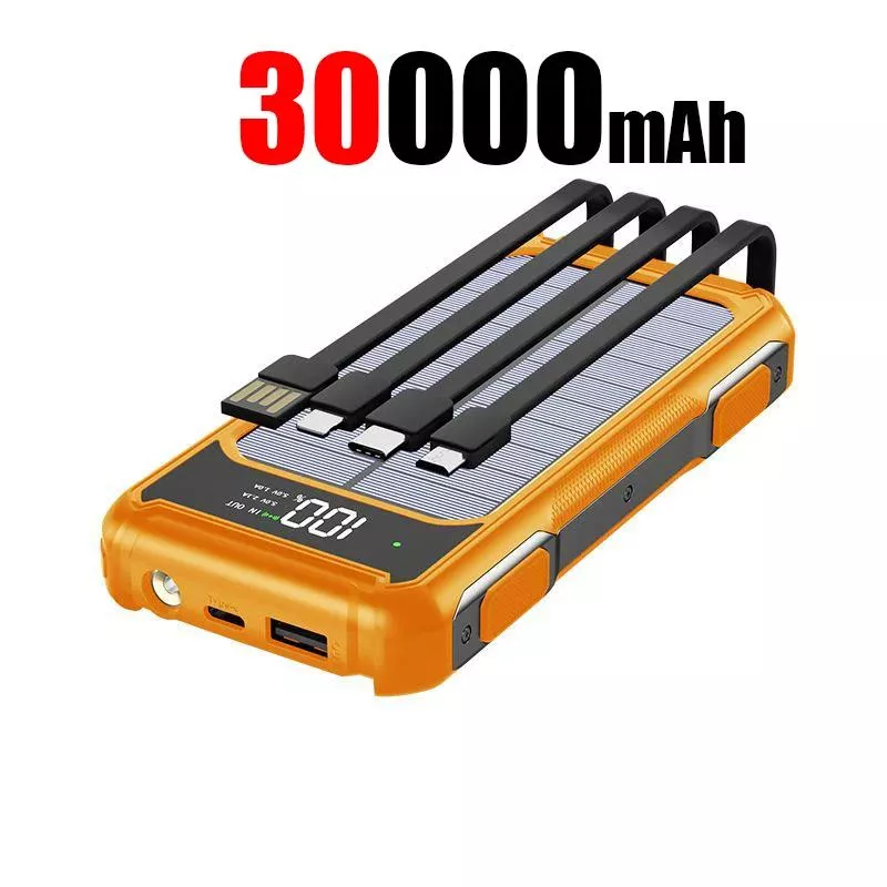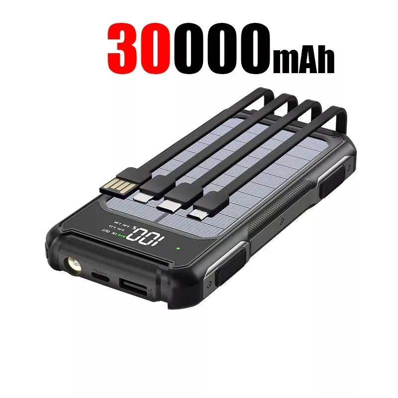 Stay fully charged no matter where life takes you. This 30000mAh high-capacity solar power bank is built to keep your devices running at full strength, whether you’re commuting through the city or venturing off-grid. With four built-in charging cables, a smart digital display, and a powerful LED laser light, it’s more than just a power bank—it’s your portable energy solution.