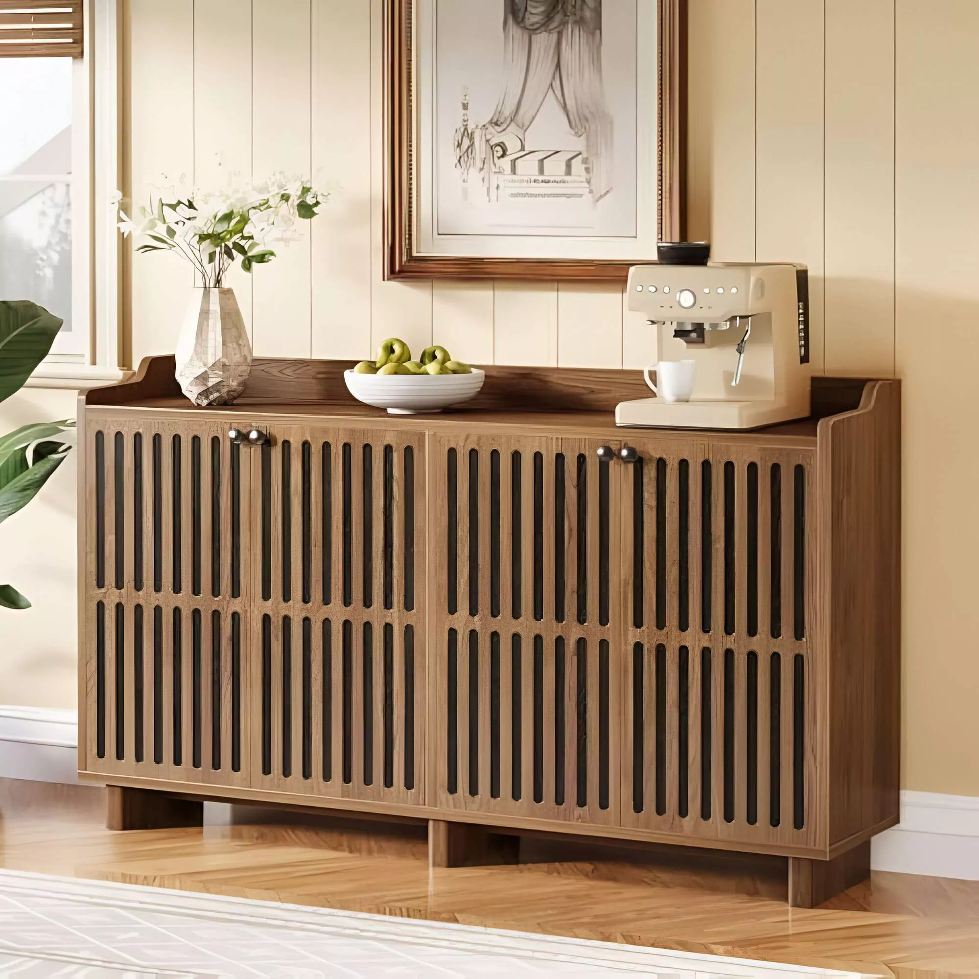 With four doors and two adjustable shelves, this credenza offers plenty of space to organize everything from dinnerware and glassware to wine bottles and kitchen appliances. The spacious 55-inch tabletop is perfect for displaying a coffee machine, toaster, or decorative items. Made from engineered wood, the cabinet is not only stylish but also built to last—resistant to stains, scratches, and wear. A sturdy wooden base with a reinforced middle foot ensures it supports up to 300 lbs with ease.
