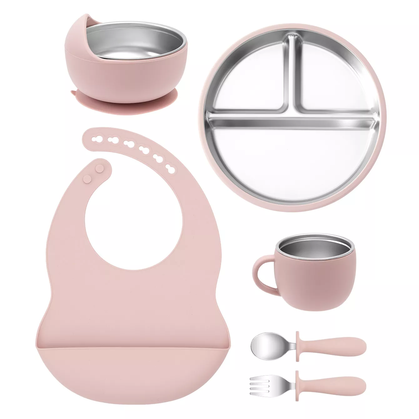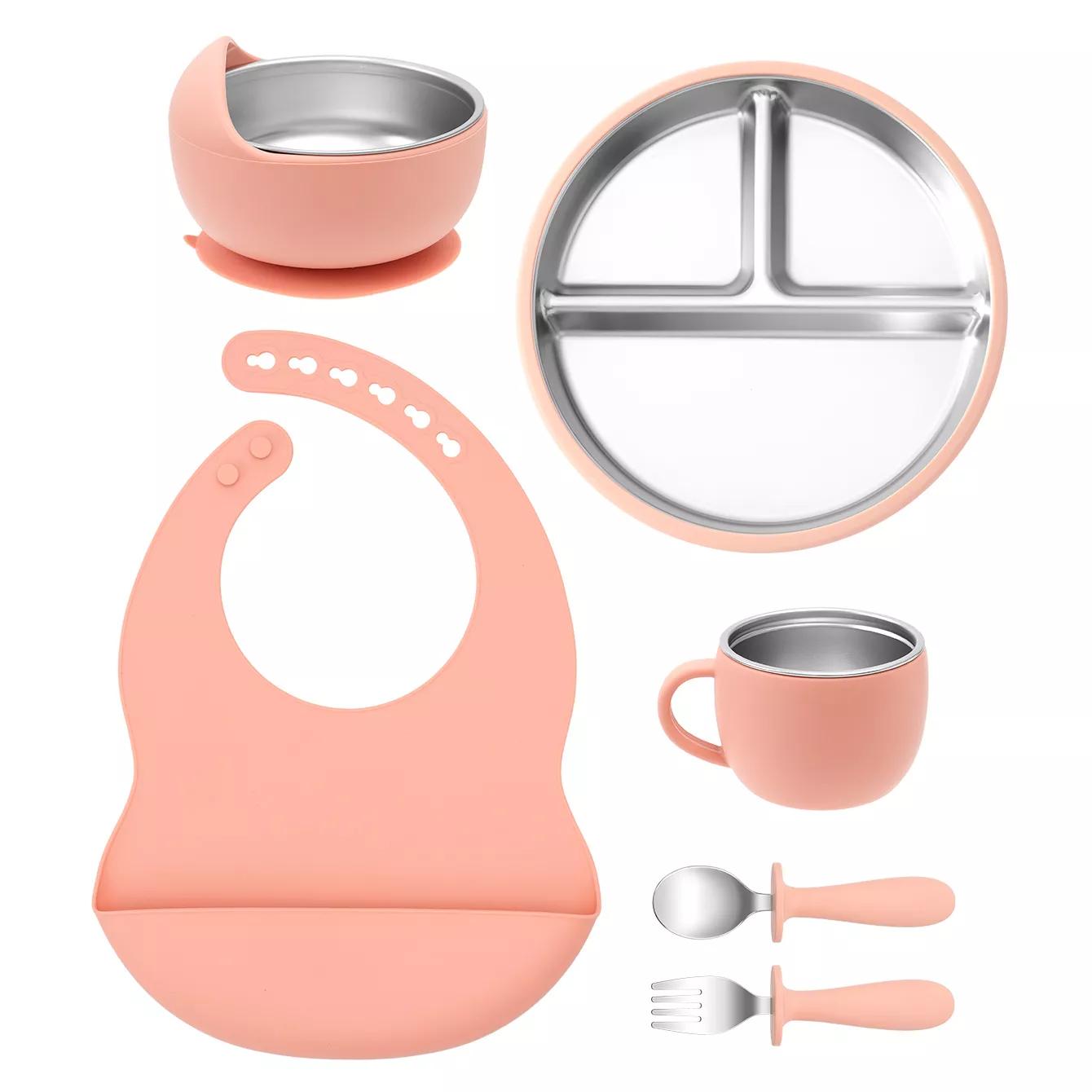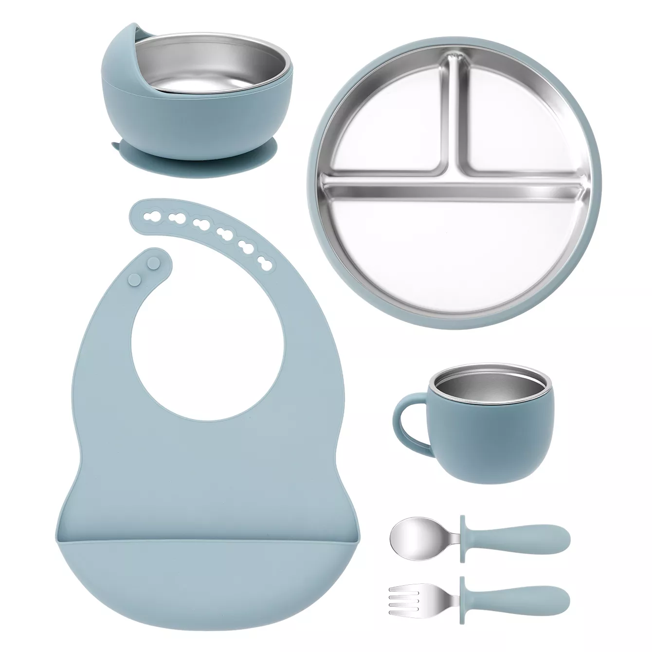 This baby feeding set is thoughtfully designed with quality and functionality in mind. The stainless steel components ensure longevity and easy cleaning, while the silicone parts provide gentle contact and prevent slips. The detachable bib is soft and flexible, making cleanup simple and keeping your baby comfortable during meals. With a compact and lightweight design, this set is ideal for home use or on-the-go feeding adventures.
