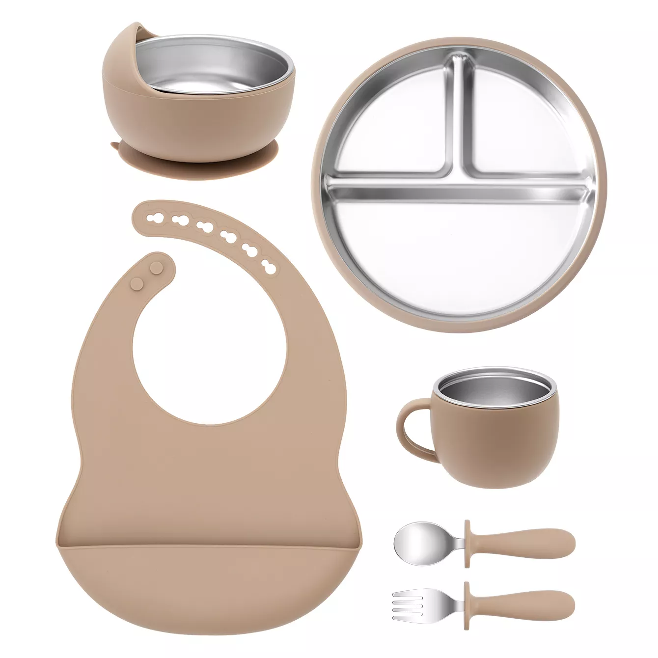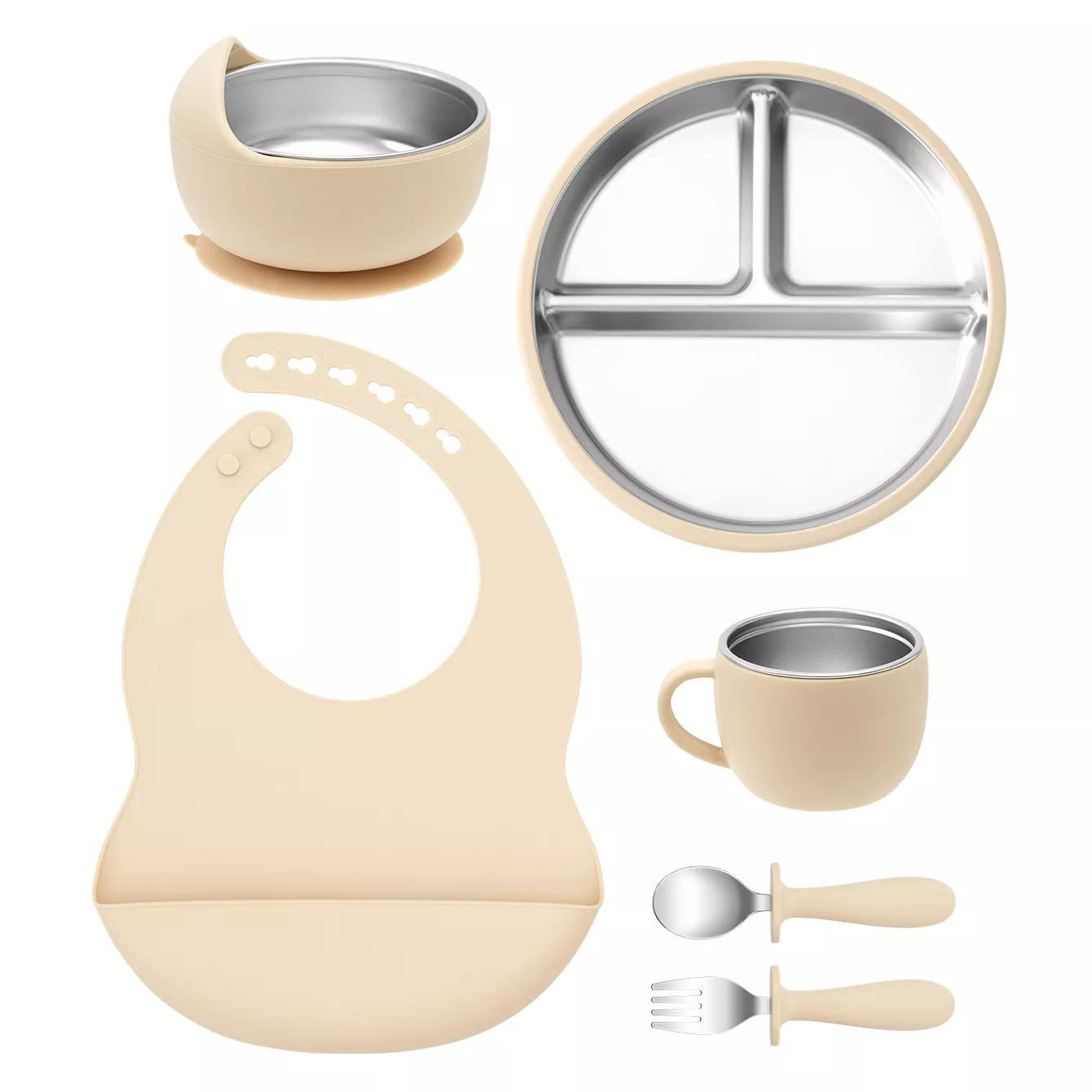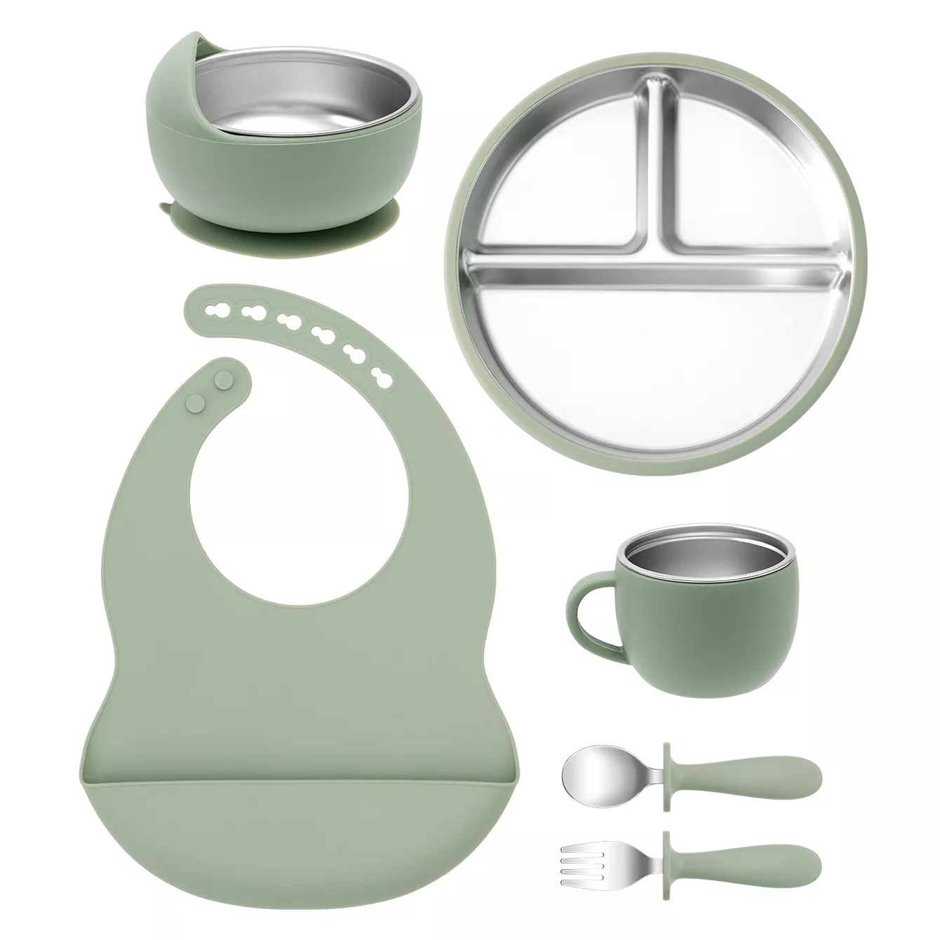 This baby feeding set is thoughtfully designed with quality and functionality in mind. The stainless steel components ensure longevity and easy cleaning, while the silicone parts provide gentle contact and prevent slips. The detachable bib is soft and flexible, making cleanup simple and keeping your baby comfortable during meals. With a compact and lightweight design, this set is ideal for home use or on-the-go feeding adventures.