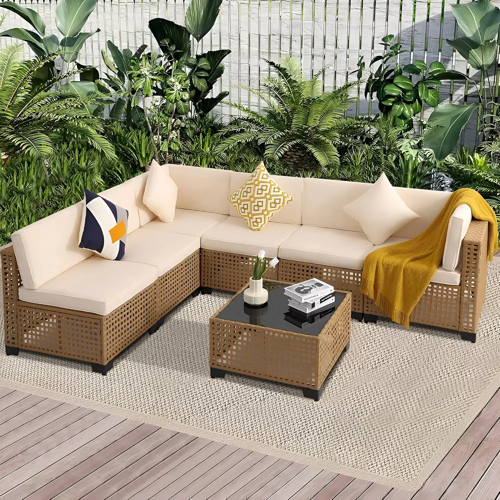 Bring resort-style relaxation to your backyard with this beautifully designed 7-Piece Outdoor Patio Furniture Set. Featuring colorful cushions, sleek rattan chairs, and a matching glass-top table, this set is perfect for turning your patio, deck, or garden into a chic and cozy hangout spot. Whether you’re hosting a summer get-together or enjoying a quiet morning coffee, this modern wicker sectional offers comfort, durability, and unbeatable style all in one package.