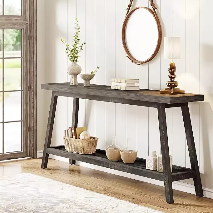 Designed to add character and charm without overwhelming your space, this 70.9-inch all-wood console table is the perfect blend of form and function. Whether placed in your entryway, hallway, or behind your couch, its slim silhouette and spacious 2-tier design offer practical storage with a warm, inviting touch. Finished in a rich vintage brown with a sturdy trapezoid base, it delivers rustic farmhouse style that complements any home décor — from cozy cottage to modern minimalist.