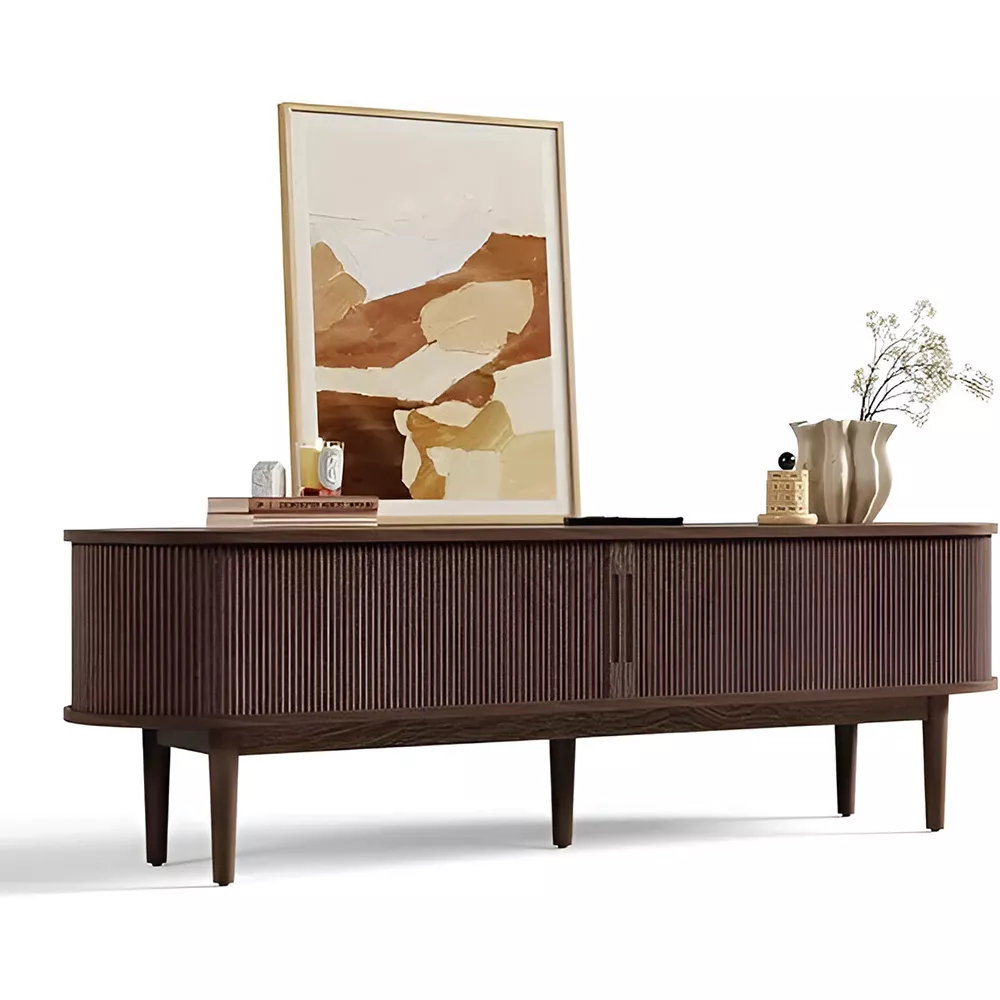 The curved silhouette not only softens the look of your space but also makes it a safer choice for families with kids by reducing sharp edges. The slatted tambour door slides smoothly to reveal spacious shelving, allowing you to keep electronics, remotes, and accessories organized and out of sight. This versatile design fits beautifully in your living room as a TV stand or in the dining area as a chic sideboard buffet cabinet.
