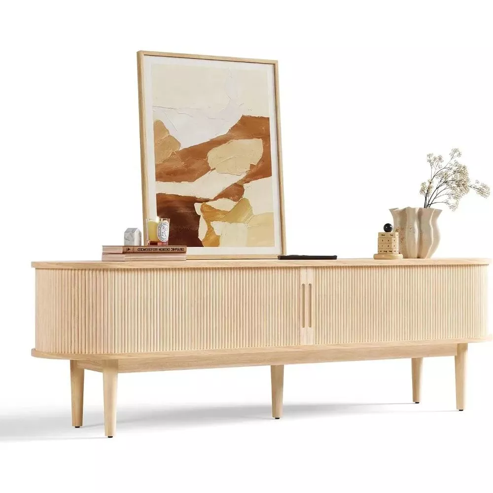 Bring timeless style and functional design into your home with this 70” Mid-Century Modern TV Stand. Perfectly crafted for TVs up to 75 inches, this piece blends sleek curves, a warm oak finish, and a beautifully fluted tambour sliding door. Whether you’re entertaining guests, enjoying movie night, or displaying your favorite décor, this stand is built to complement any space while adding a sophisticated, retro-inspired touch.