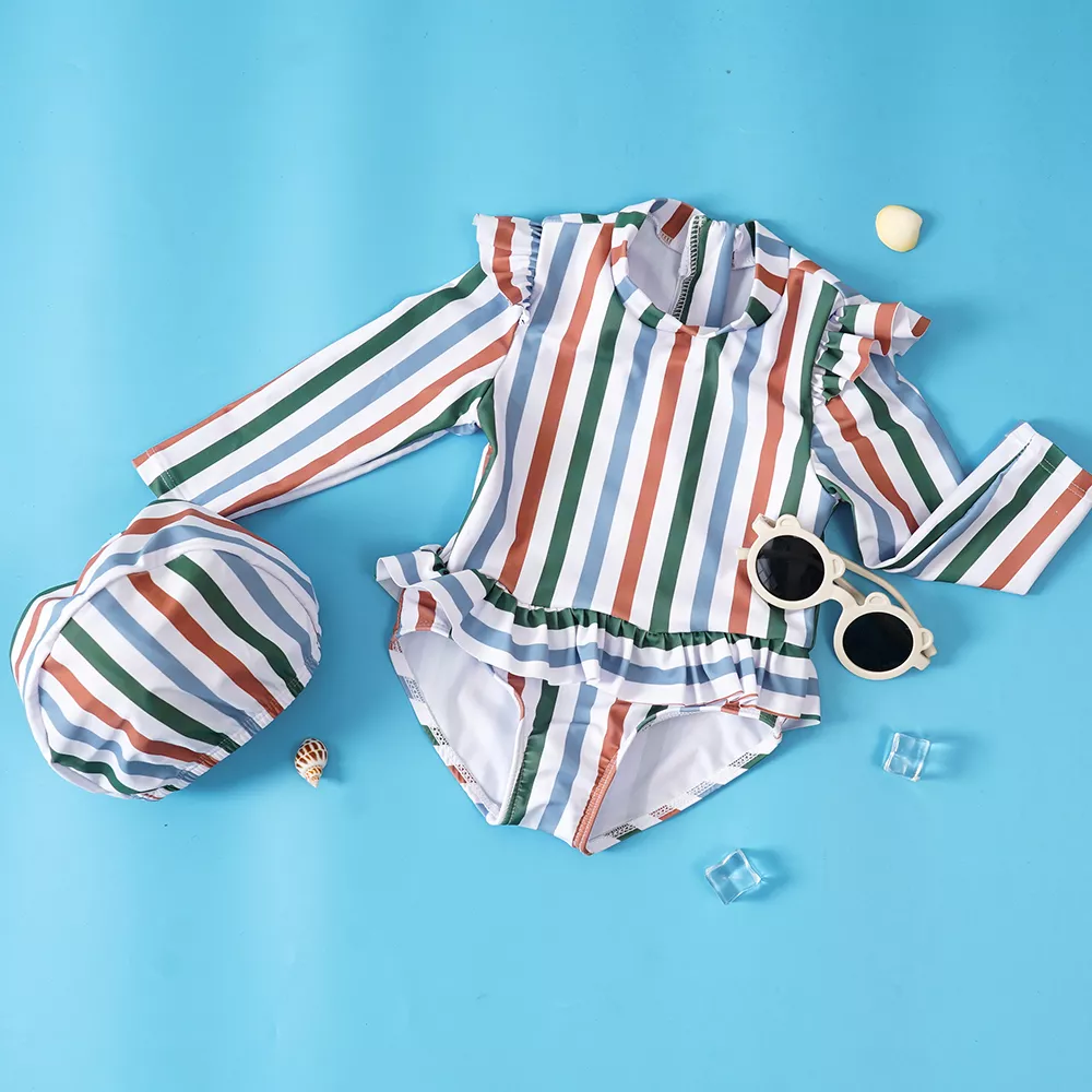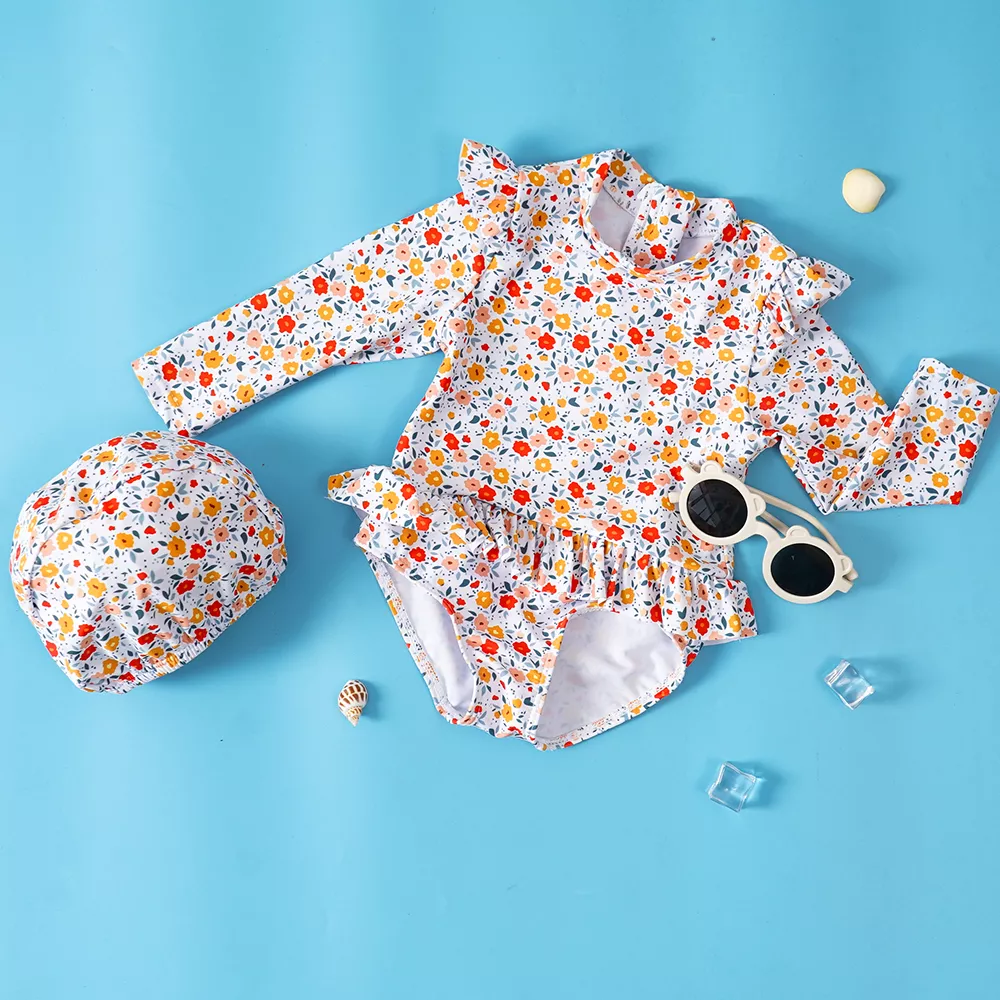 Unlike basic baby swimsuits, this set stands out with its combination of fashion and function. The long sleeve design offers extra protection without compromising style. The coordinated hat not only completes the look but also adds essential coverage for sunny days. The playful prints add a touch of personality, making your baby girl the star of every splash zone.