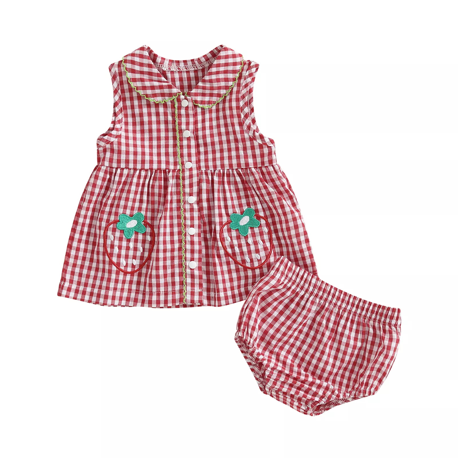 Baby Girl Strawberry Embroidery Plaid Summer Outfit – Tank Top & Shorts Set