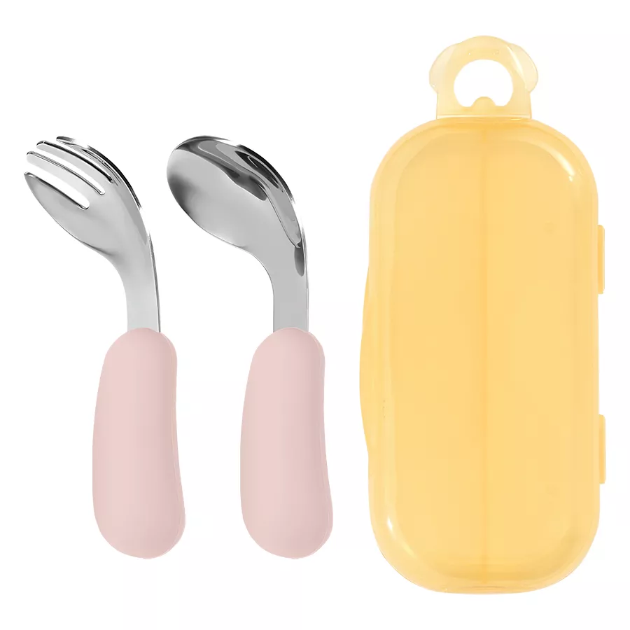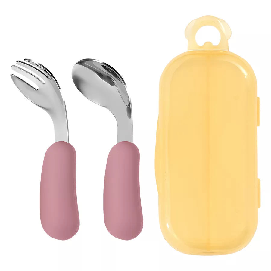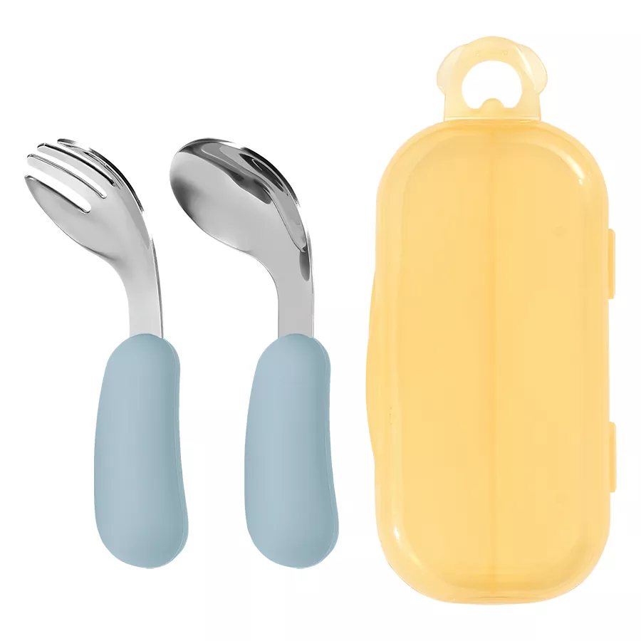 The set includes one spoon and one fork, both made with durable stainless steel heads and soft, non-slip silicone handles. Designed to support fine motor development, the handles are perfectly shaped for a toddler’s grip—giving them the confidence to explore food independently. Whether it’s breakfast, lunch, or dinner, this set is ready for everyday use at home or on the go.