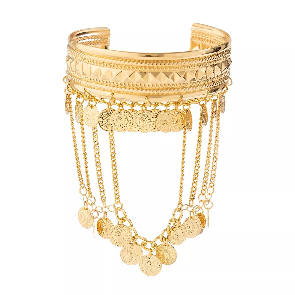 Carefully crafted from a mix of durable iron alloy and lightweight aluminum, this open cuff bracelet features an exaggerated multilayer design with dangling tassel coins that sway with every movement. Available in classic gold and silver tones, it’s designed to sit comfortably on your upper arm, making it a unique twist on traditional wrist bangles. The geometric patterns and vintage finish give it a one-of-a-kind, artisan feel that’s perfect for women who love bold jewelry with a story.