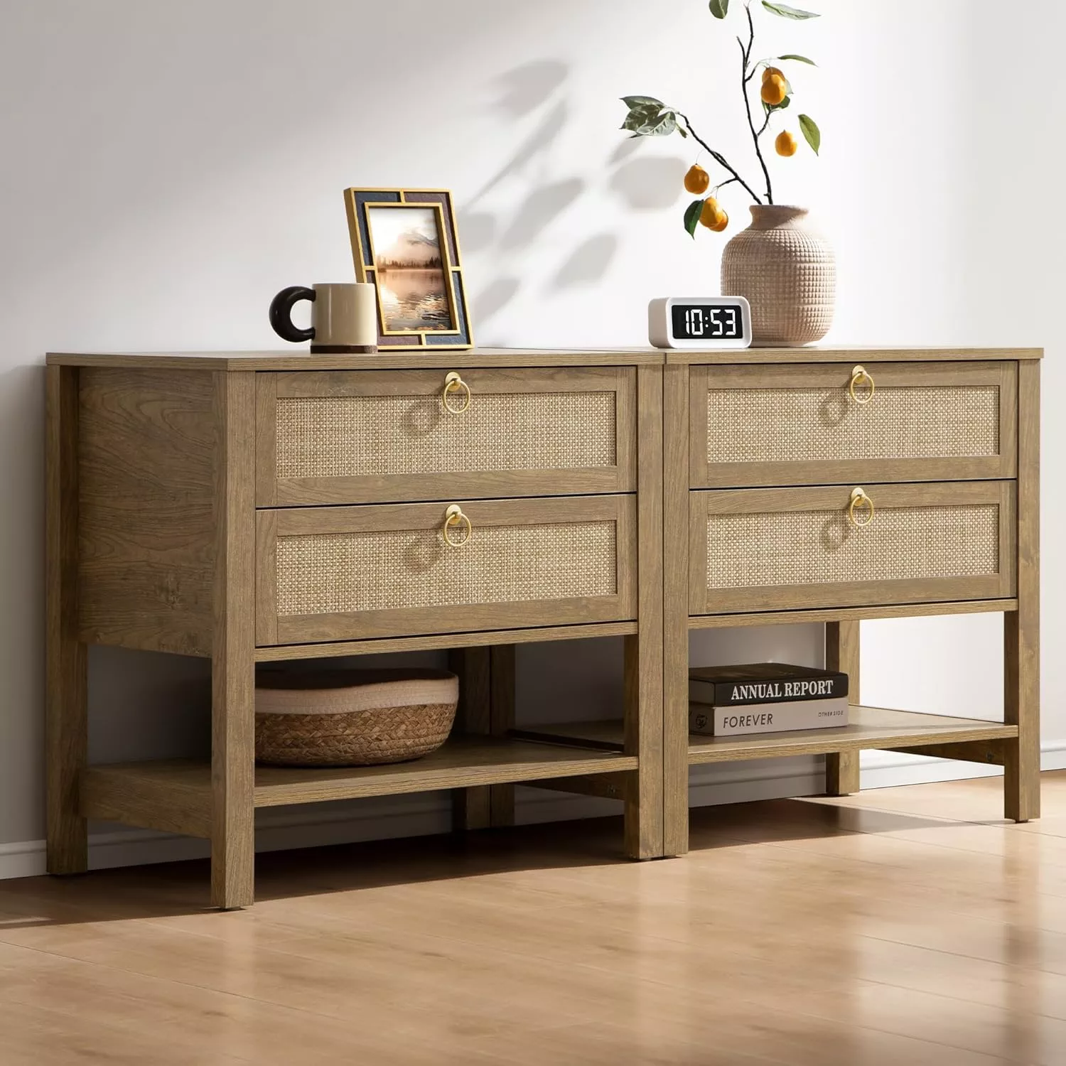 Each nightstand features two spacious drawers and an open lower shelf, giving you plenty of room to store books, glasses, remotes, or other bedside must-haves. The 25.6-inch height fits perfectly alongside most standard beds, making it a convenient and functional choice for nightly essentials.