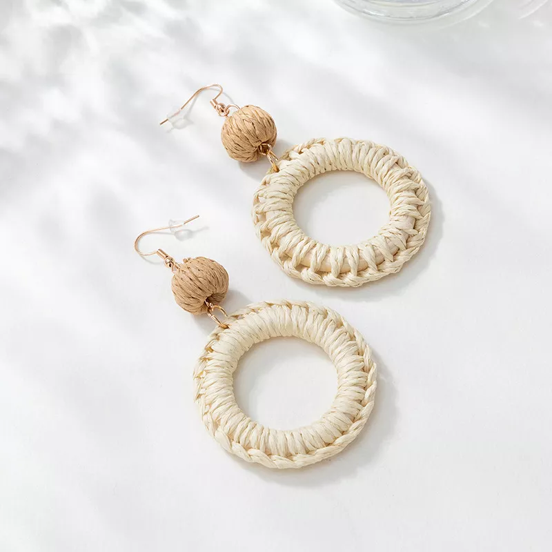 Each pair is made from finely woven raffia and rattan-like materials, giving them an airy, organic texture that’s both eye-catching and comfortable to wear. The circular silhouette brings a geometric edge to the otherwise laid-back design, making them a versatile choice for both minimalist and boho-inspired looks.