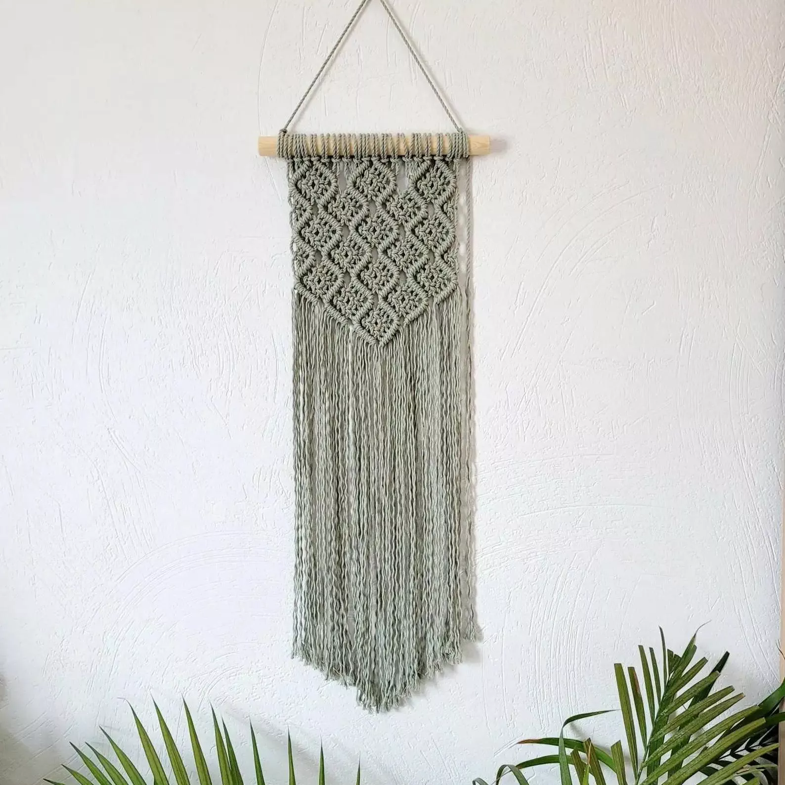 Transform any space into a serene retreat with this handcrafted Macrame Wall Hanging in a soothing blend of sage green and natural white. Whether you’re refreshing a bedroom, styling an office, or adding charm to a cozy nook, this knitted wall decor brings a calming, bohemian flair that instantly uplifts the room. Every piece is handmade using 100% natural 4mm cotton cord and suspended from a smooth wooden stick for a rustic, grounded touch. No harsh chemicals, just beautiful, breathable textile art you’ll love looking at every day.