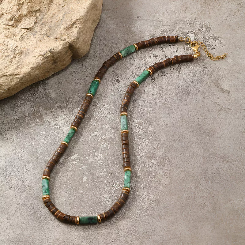 This necklace is best worn for casual occasions, beachwear, weekend getaways, or as a distinctive piece in your everyday rotation. What makes it truly special is its use of eco-friendly materials—each bead tells its own story, crafted from nature and styled with purpose.