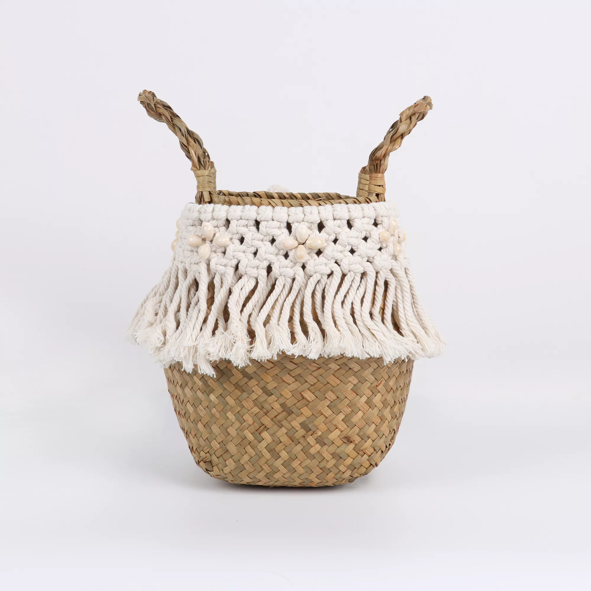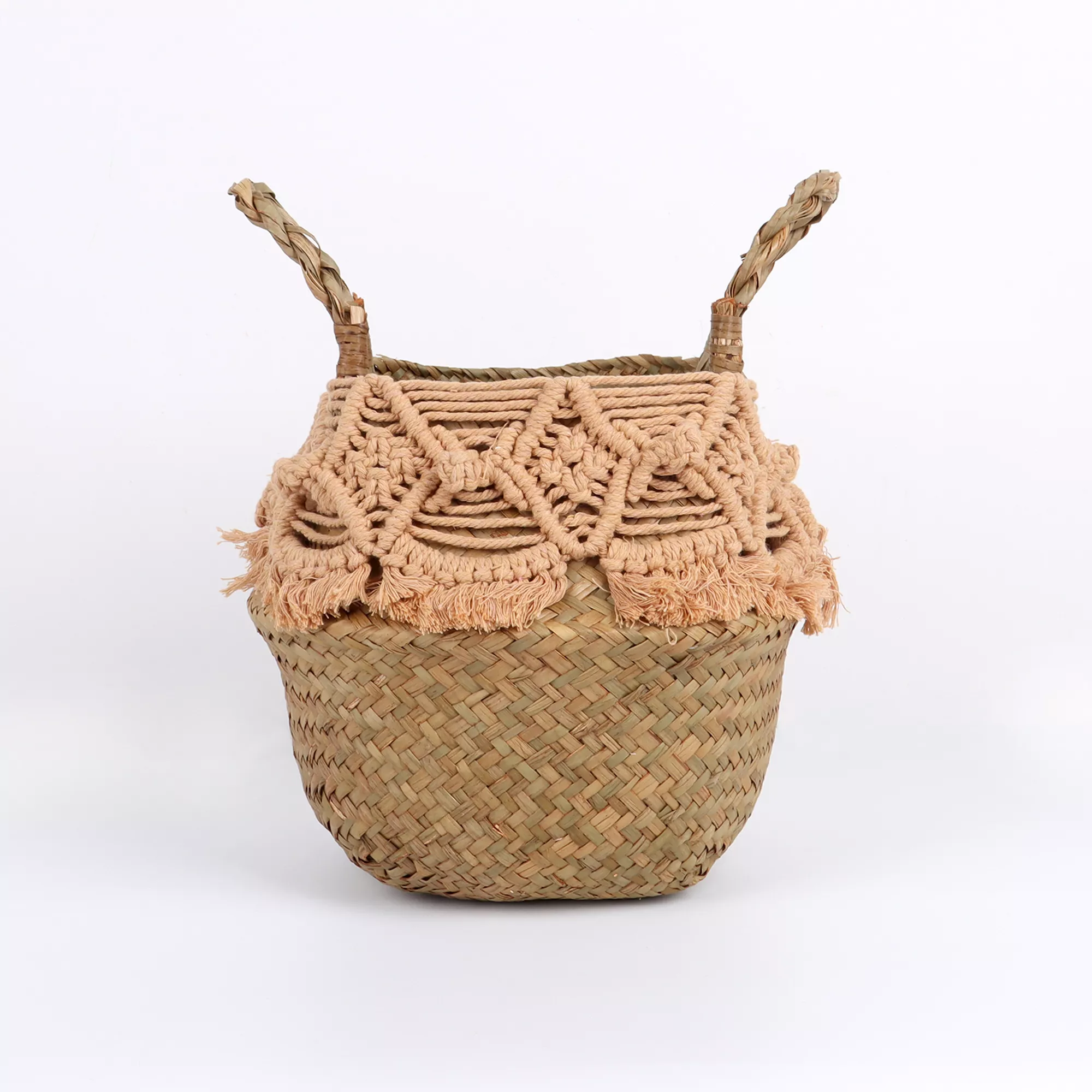 Crafted by skilled artisans, each basket is made with care, offering a unique and authentic feel. The charming macrame tassel detail adds a touch of boho sophistication, making it a standout piece whether displayed on a shelf, hung on a wall, or placed in a cozy nook.