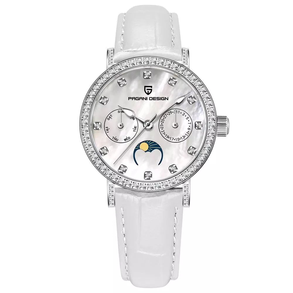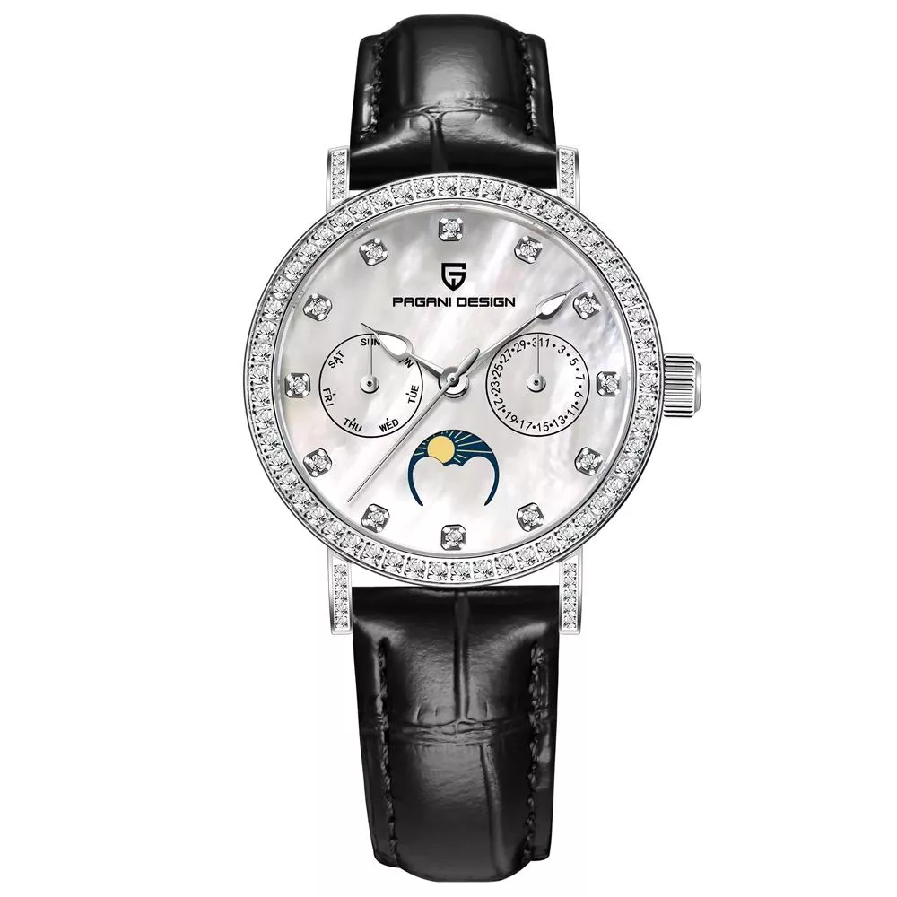 The perfect blend of fashion and function, this watch also includes a complete calendar, moon phase display, and auto date — all built into a lightweight design that’s comfortable to wear all day. Whether you’re at a business meeting or enjoying a night out, this watch complements your look with effortless charm.
