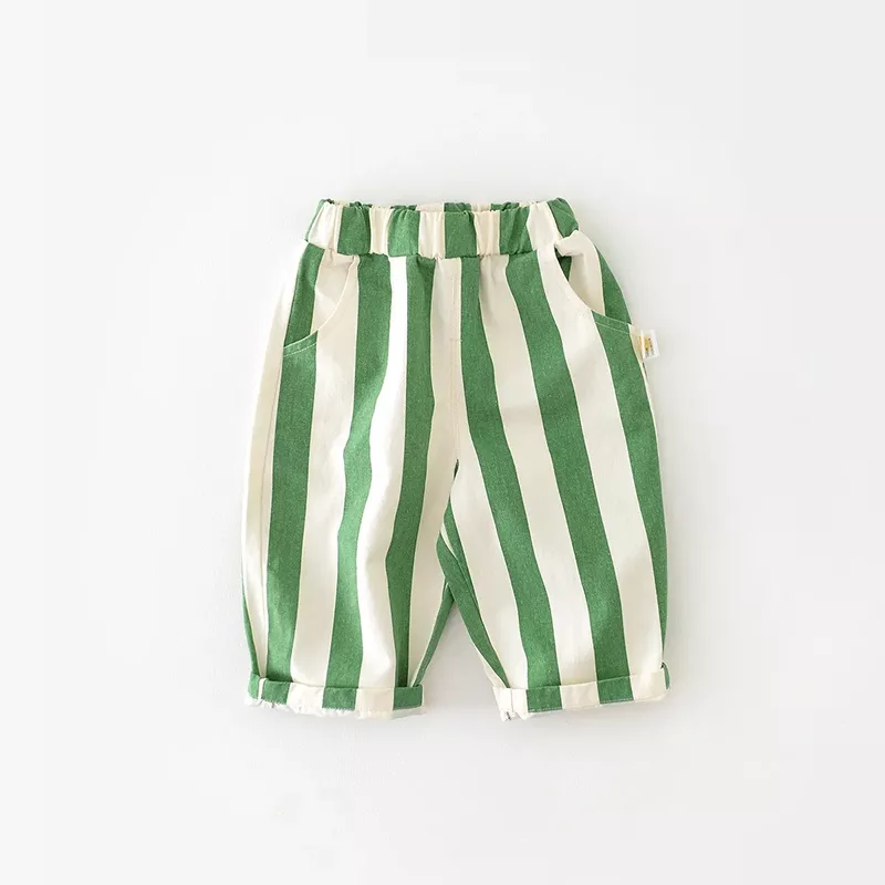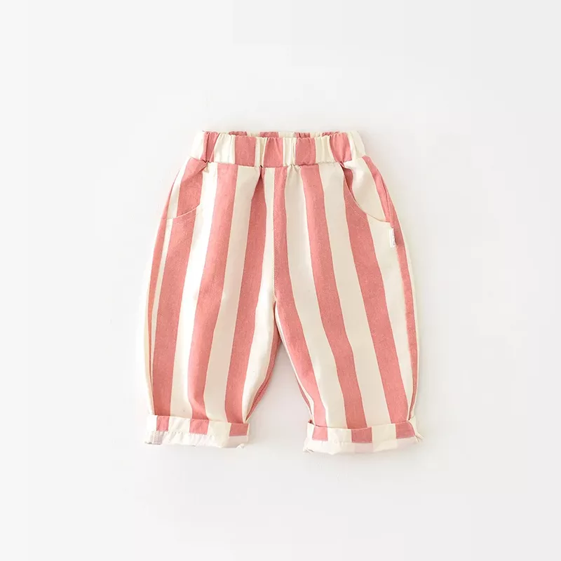 Crafted from soft, breathable broadcloth with 95% cotton, these striped pants are gentle on delicate skin and ideal for warmer days. The high-waist elastic design ensures a snug, comfortable fit that stays in place without pinching or sliding down. The relaxed fit allows freedom of movement, so your little one can play, crawl, or nap in total comfort—all while looking absolutely adorable.