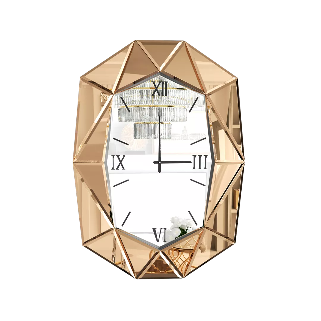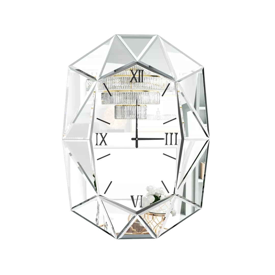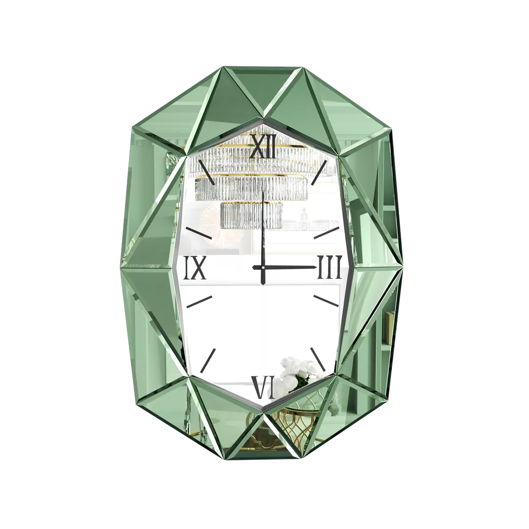 Elevate your wall decor with this striking Irregular Beveled Mirror Wall Clock, a modern timepiece that fuses classic charm with luxurious design. Featuring a distinctive geometric silhouette, this wall clock is a true statement piece. Its shimmering, beveled diamond frame—available in silver, tawny brown, or green—catches and reflects light beautifully from every angle, enhancing the ambiance of any room it graces.