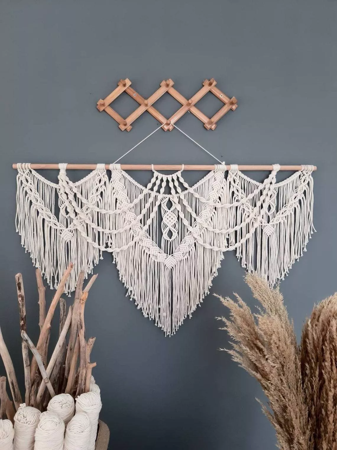 Turn any blank wall into a cozy, stylish focal point with this Large Bohemian Macrame Wall Hanging. Handwoven with care and crafted from 100% high-quality cotton rope, this creamy-white tapestry blends artisanal texture with minimalist charm. Its oversized design—measuring approximately 55 inches wide by 31 inches tall—creates a stunning visual impact while adding warmth and character to your space.