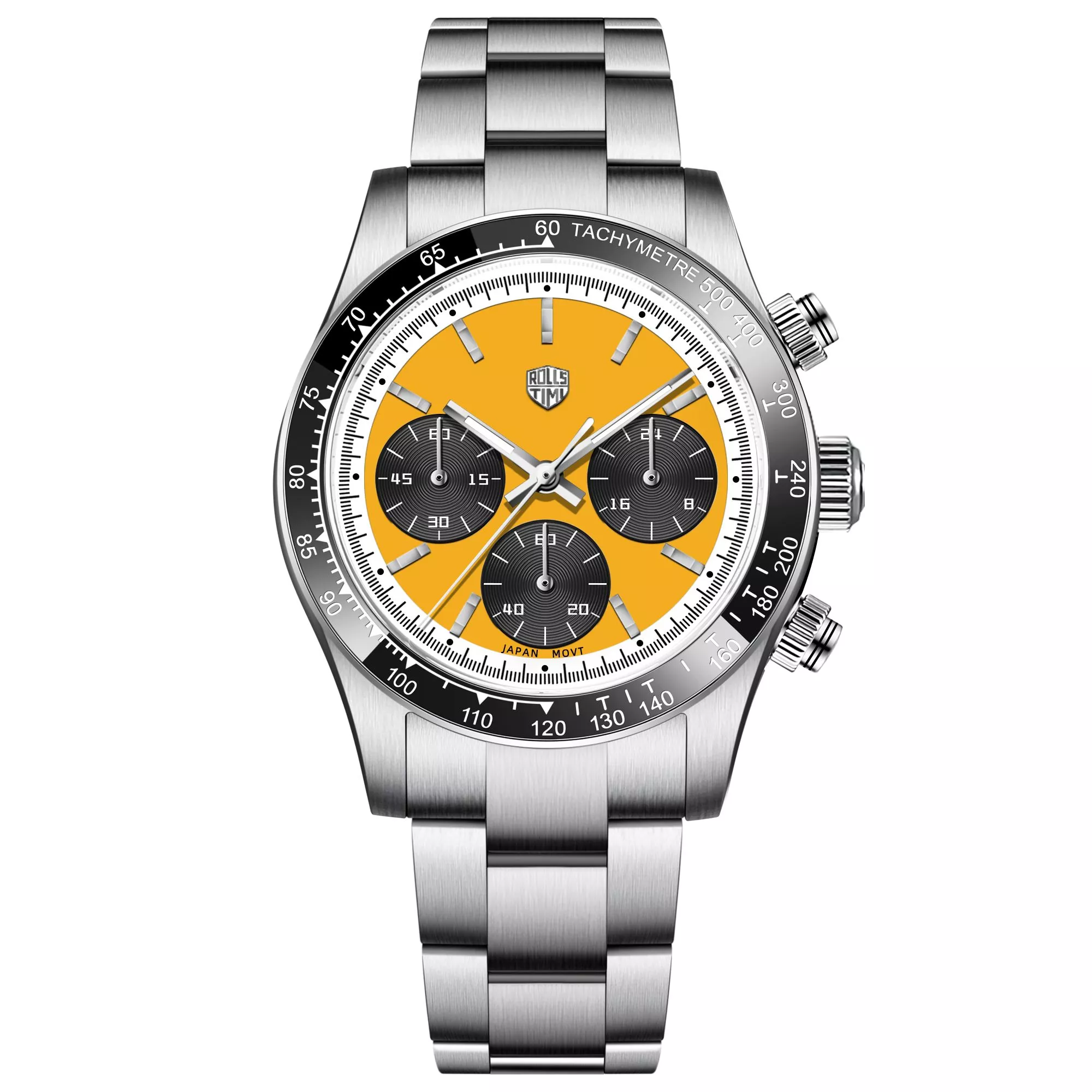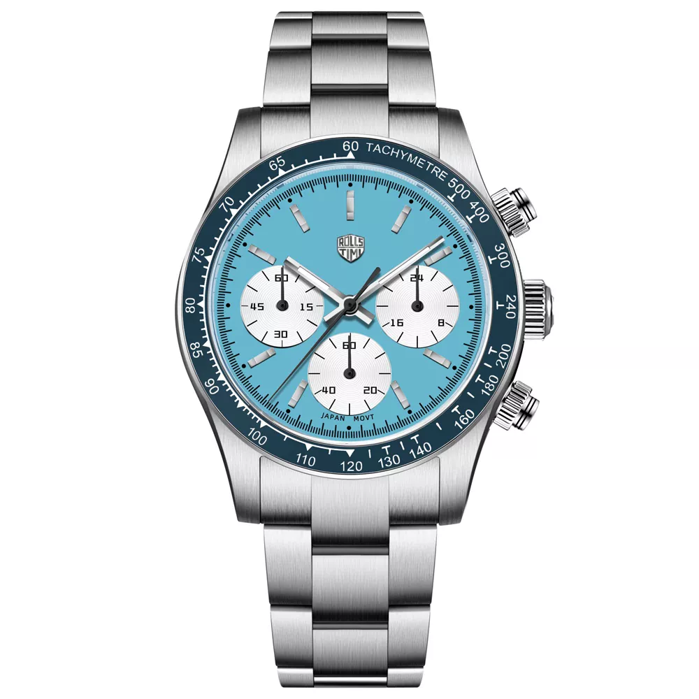 This timepiece features a 40mm stainless steel case with a solid case back and a polished, flexible bracelet for comfortable all-day wear. The synthetic sapphire crystal dial window comes with anti-reflective coating, offering crystal-clear visibility under any lighting. The watch is powered by a reliable Japanese VK63 chronograph quartz movement—famed for its precision and long-lasting performance. With its stopwatch function, luminous hands, and auto date display, every feature is designed to enhance your everyday efficiency.