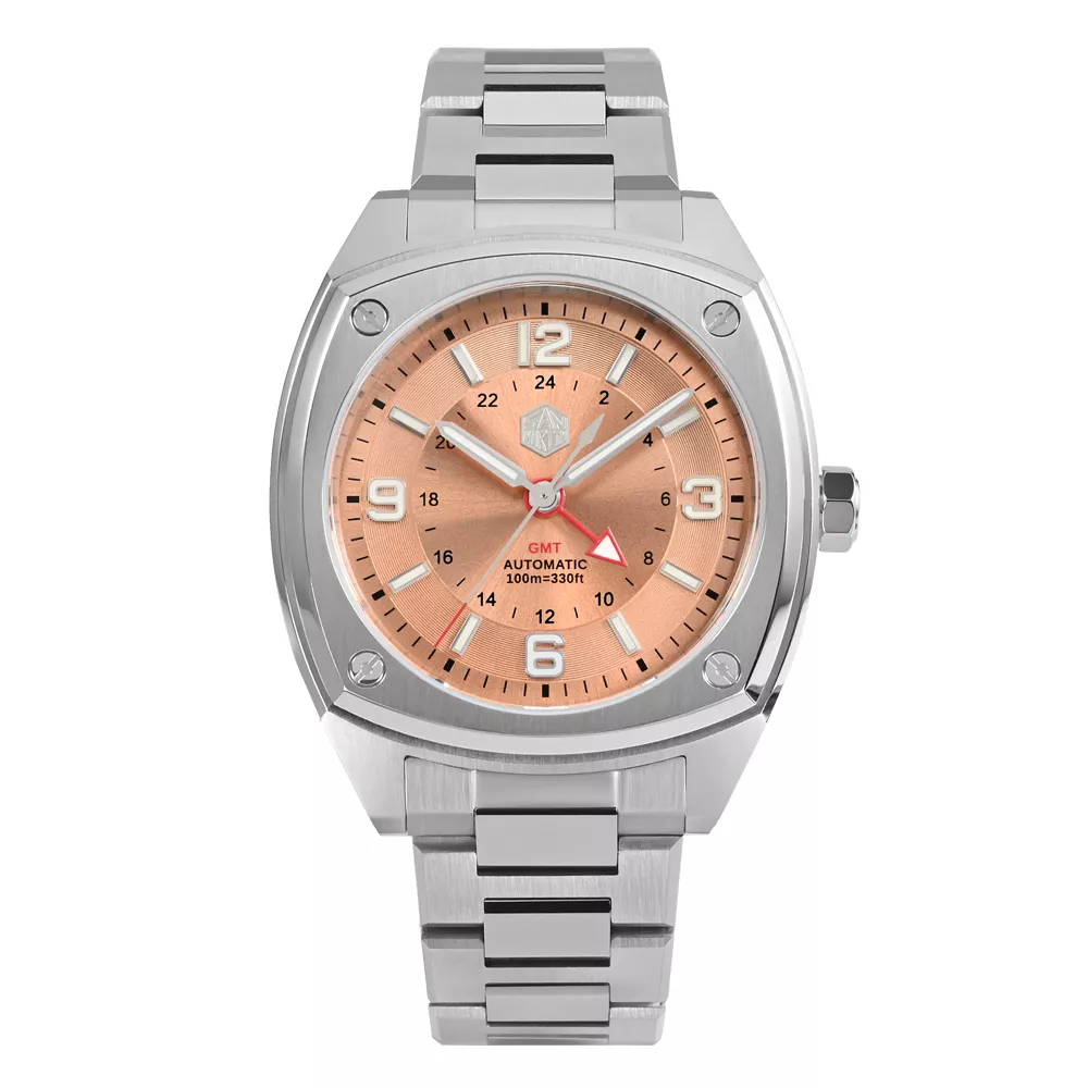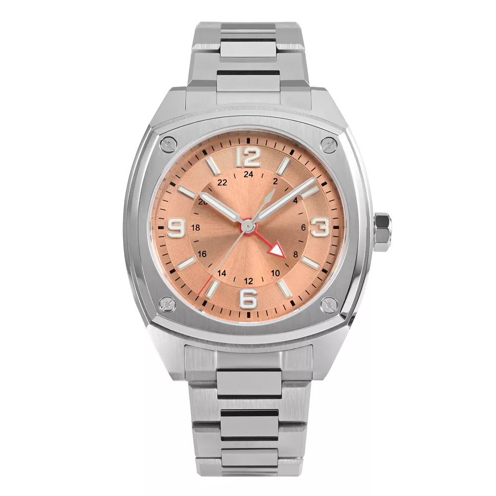 Featuring a distinctive square case and a choice of sunray blue or salmon dial, this automatic mechanical watch is powered by a reliable GMT movement, allowing you to track multiple time zones with ease. Whether you’re navigating business across continents or heading out for an adventurous weekend, this timepiece delivers both functionality and flair.