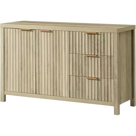 Crafted with durability in mind, the cabinet is made from high-quality exterior-grade MDF and topped with a 1.4-inch thick surface that offers impressive load-bearing capacity. The sunwashed ash oak finish gives it a soft, contemporary appeal that blends effortlessly into both modern and classic interiors. The design includes two doors, three roomy drawers, and three adjustable shelves, allowing you to easily customize your storage layout to fit anything from dishes and books to craft supplies or home office items.