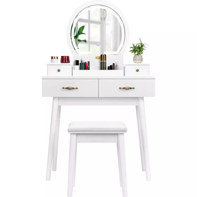 Well, let me tell you about this vanity set that I've got. First off, its modern design is a total showstopper. It's so sleek and stylish that it immediately caught my eye when I saw it online. But hey, don't get fooled thinking it's all about the looks because there’s way more to this beauty than just being pretty. One of the best things about this gem? The functionality! Oh man, talk about having everything in place! This bad boy comes with these spacious drawers - no kidding - they can hold all my cosmetics and then some. No more rummaging through different boxes or bags trying to find that one lipstick or eyeshadow palette; now everything is right at hand where I need them. But wait till you hear about the mirror – not your regular old mirror mind ya – but a 3-color lighted one! It’s like having professional lighting at home which makes getting ready an absolute breeze regardless of whether it's bright day outside or late evening hours.
