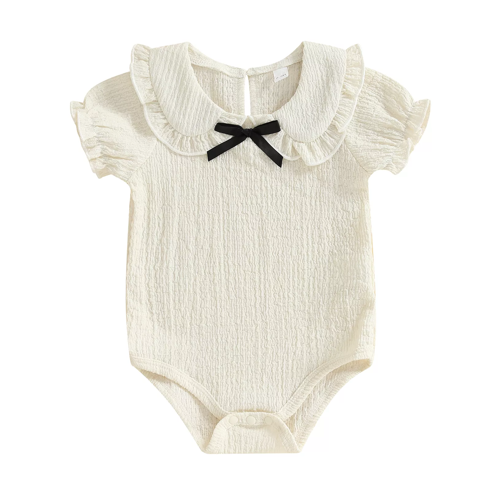 Bring effortless charm to your baby girl’s wardrobe with this cute and comfy summer romper. Crafted for warm-weather play and picture-perfect moments, this solid-colored jumpsuit is a must-have for every stylish newborn or toddler. The classic doll collar and delicate bow detail give it a timeless, doll-like appeal, while the ruffled short sleeves and soft fabric keep your baby cool and comfortable all day long.