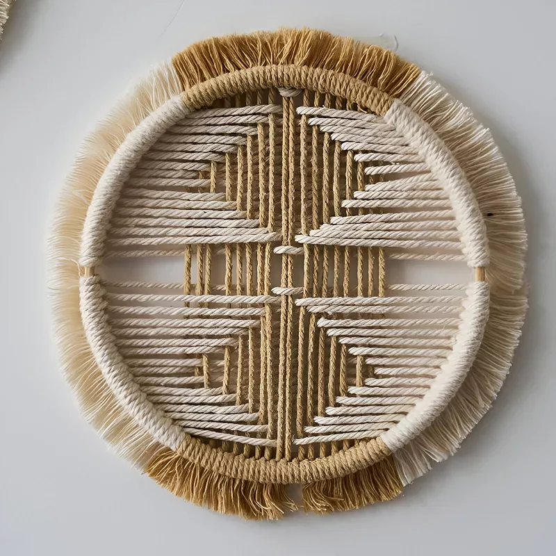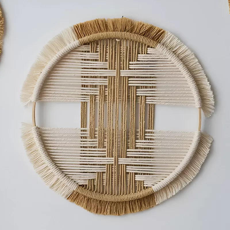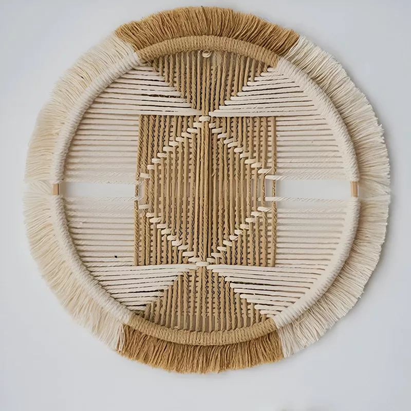 Give your room a soft, soulful upgrade with this Round Mandala Boho Wall Tapestry. Beautifully handmade using a blend of natural cotton and polyester, this macrame-inspired piece features a delicate mandala design framed within a sturdy bamboo circle. Whether you hang it above your bed as a unique headboard or place it in your living room as a centerpiece, it adds a calming and stylish touch to any space.