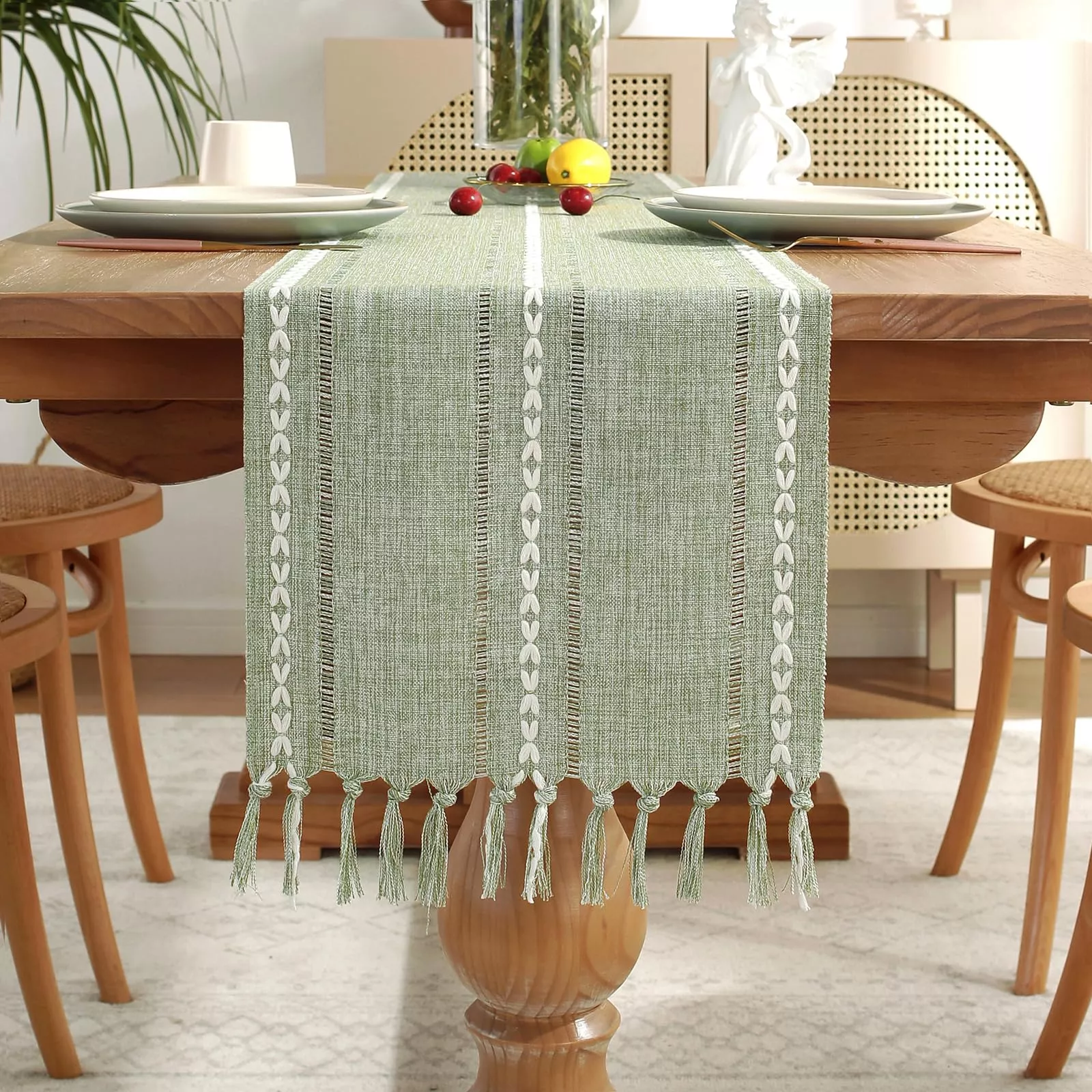 Elevate your dining experience with this Rustic Farmhouse Cotton Linen Table Runner, the perfect accent for anyone who loves cozy, inviting spaces with a touch of elegance. Designed with care and crafted from premium cotton-linen blend, this table runner blends natural texture with refined style, making it a must-have for both everyday meals and special gatherings. With its simple embroidered geometric pattern and delicate tassels at each end, it adds the perfect finishing touch to any table setting—from casual breakfasts to festive dinner parties.