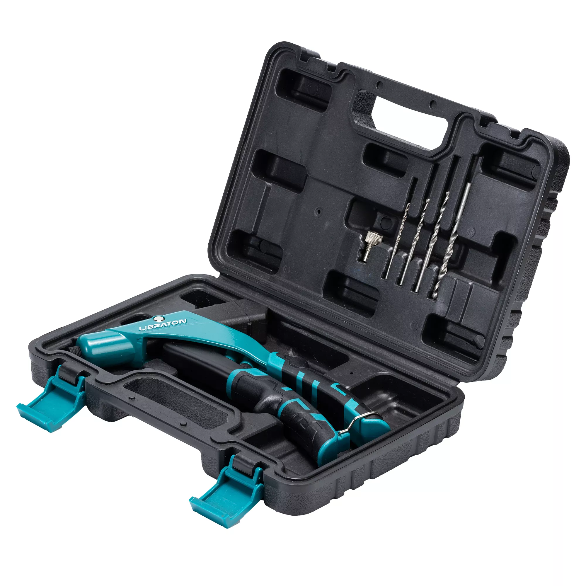 Crafted from durable die-cast aluminum alloy and featuring a Cr-Mo steel three-jaw head, this rivet gun set is made to withstand demanding tasks. Heat-treated alloy steel components add extra strength and reliability. Whether you’re working in tight spaces or need a quick fix on-site, this tool is tough enough to get the job done.