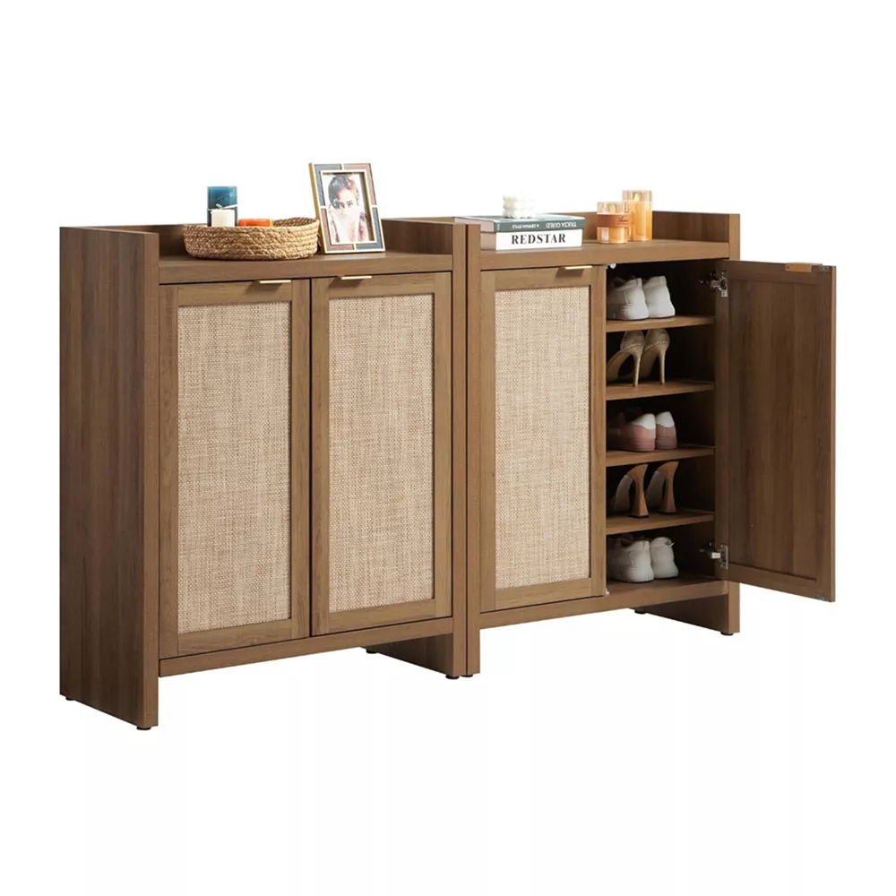 Declutter your space and elevate your décor with the Tall Rattan Shoe Storage Cabinet. This eye-catching piece blends rustic farmhouse charm with modern function, featuring classic wood construction and natural rattan-woven doors. Whether you’re storing shoes, bags, or everyday essentials, this cabinet helps you keep everything organized while adding character and warmth to your home.