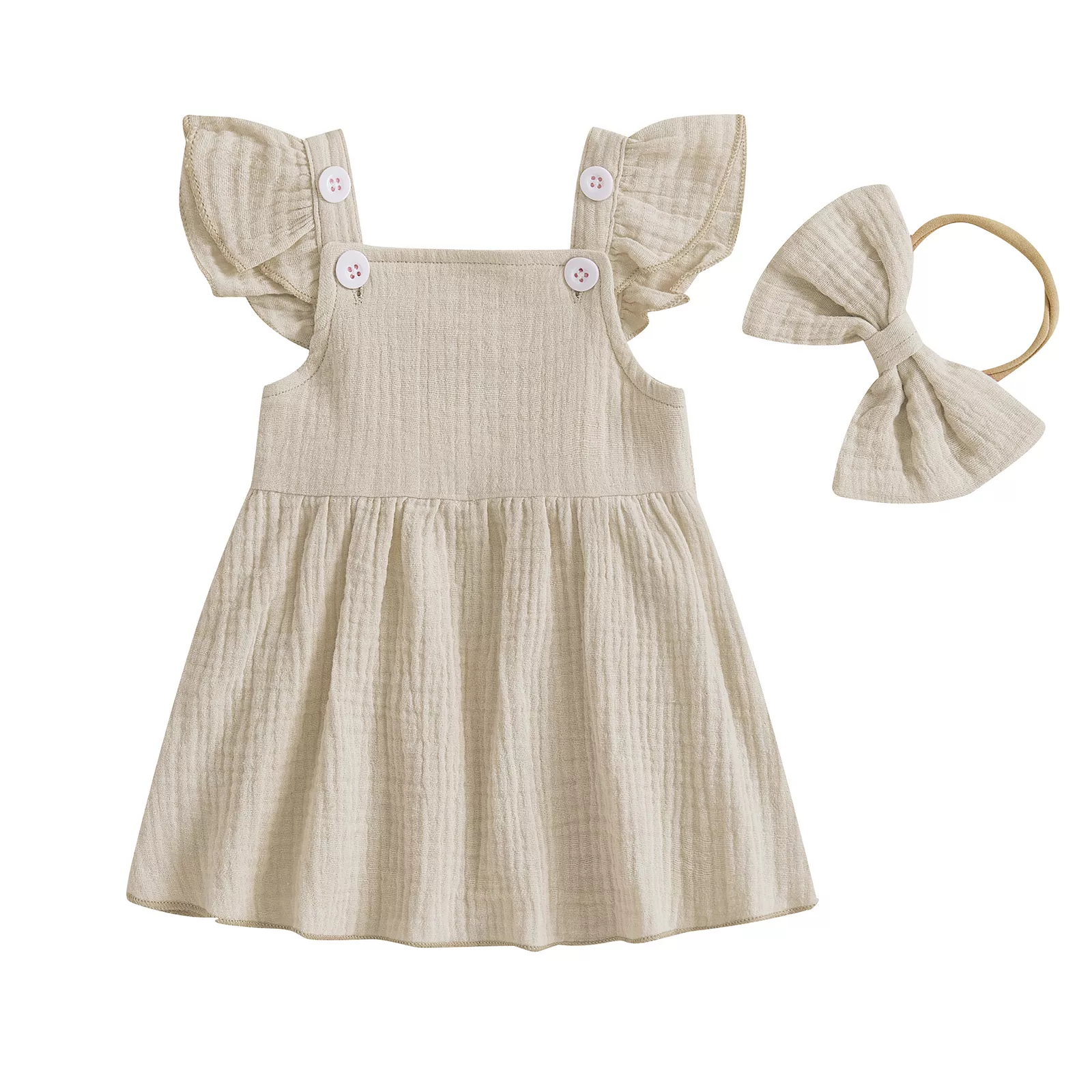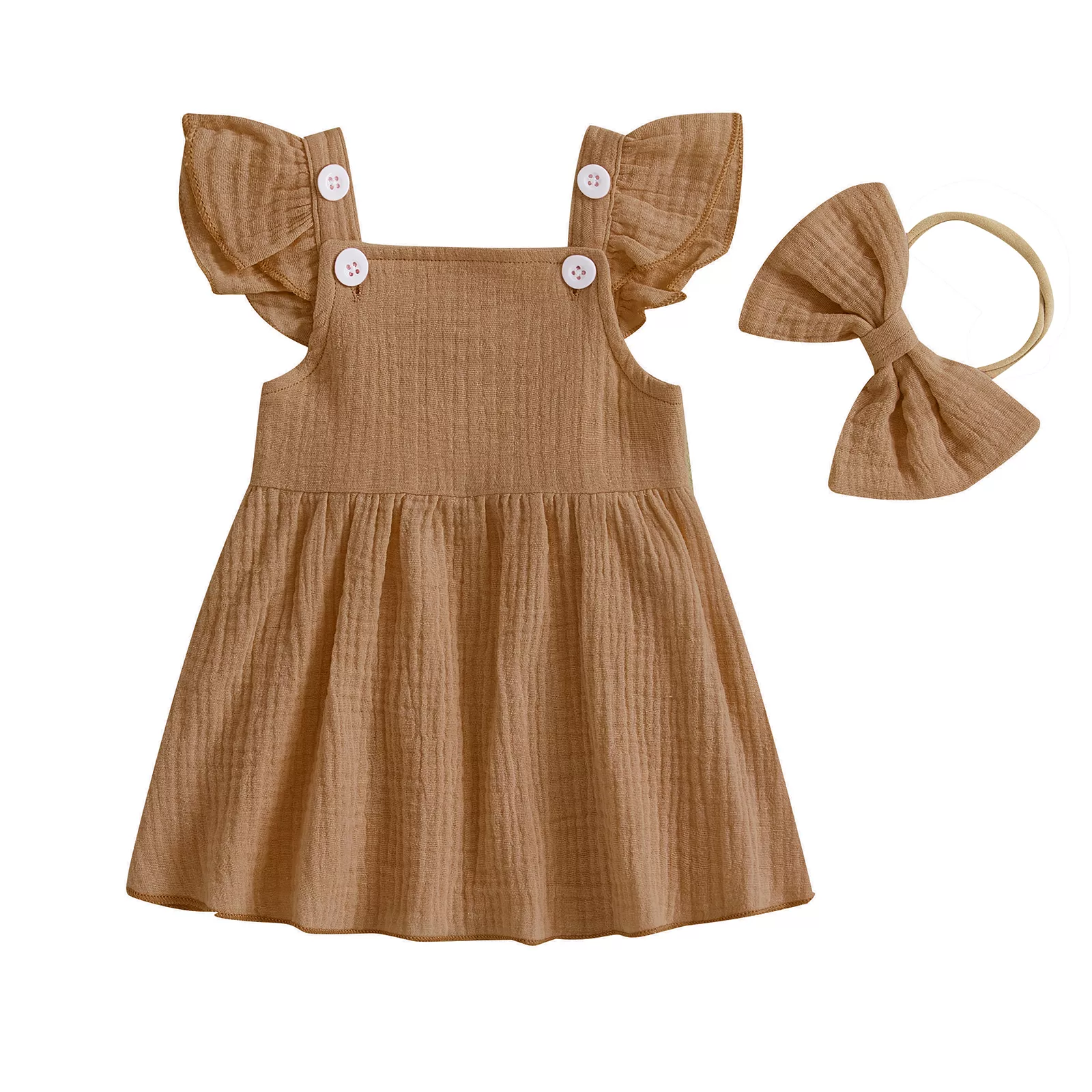 This sweet and stylish dress is crafted from a breathable blend of 95% cotton and 5% spandex, offering the perfect mix of softness and stretch. The solid color design makes it easy to accessorize, while the knee-length cut adds just the right touch of elegance. It comes complete with a matching bow headband to tie the whole look together—literally!