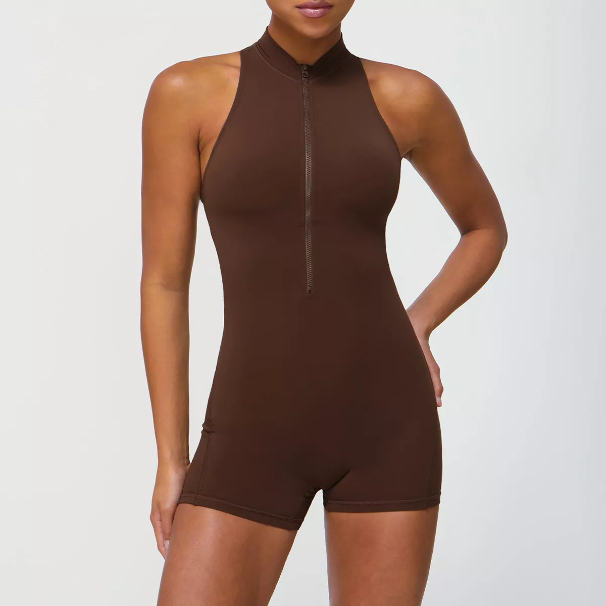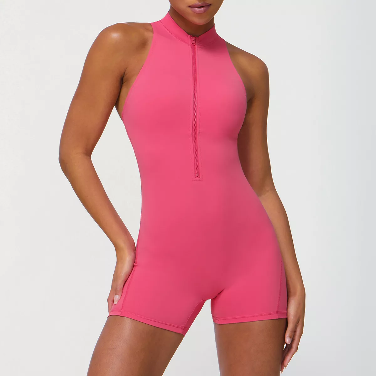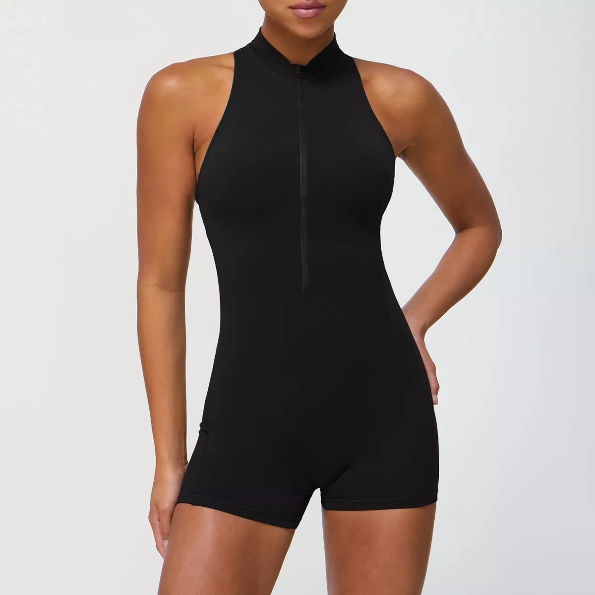 This jumpsuit is crafted from a premium blend of nylon and spandex, giving you just the right amount of stretch while offering a snug, supportive fit. The smooth knit fabric feels soft against your skin and resists wrinkles, shrinking, and pilling—so it keeps its shape and sleek look, workout after workout. The sleeveless design and short cut allow for full mobility, while the front zipper makes it easy to slip on and off without hassle.
