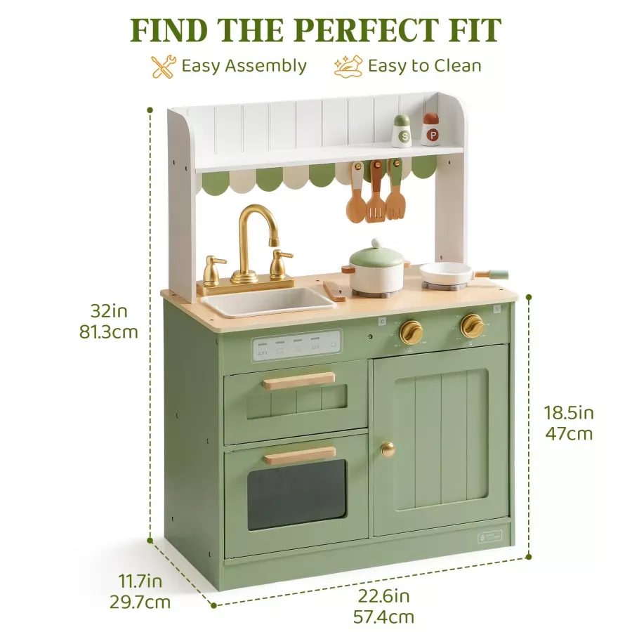 Turn everyday play into an exciting culinary adventure with this charming wooden pretend play kitchen set. Designed for children ages 3 and up, this beautifully crafted toy kitchen invites kids into a world of creativity, learning, and hands-on fun. Whether they’re cooking up imaginary feasts or learning to “chop” vegetables, little chefs will love exploring all the fun details of this elegant kitchen set.